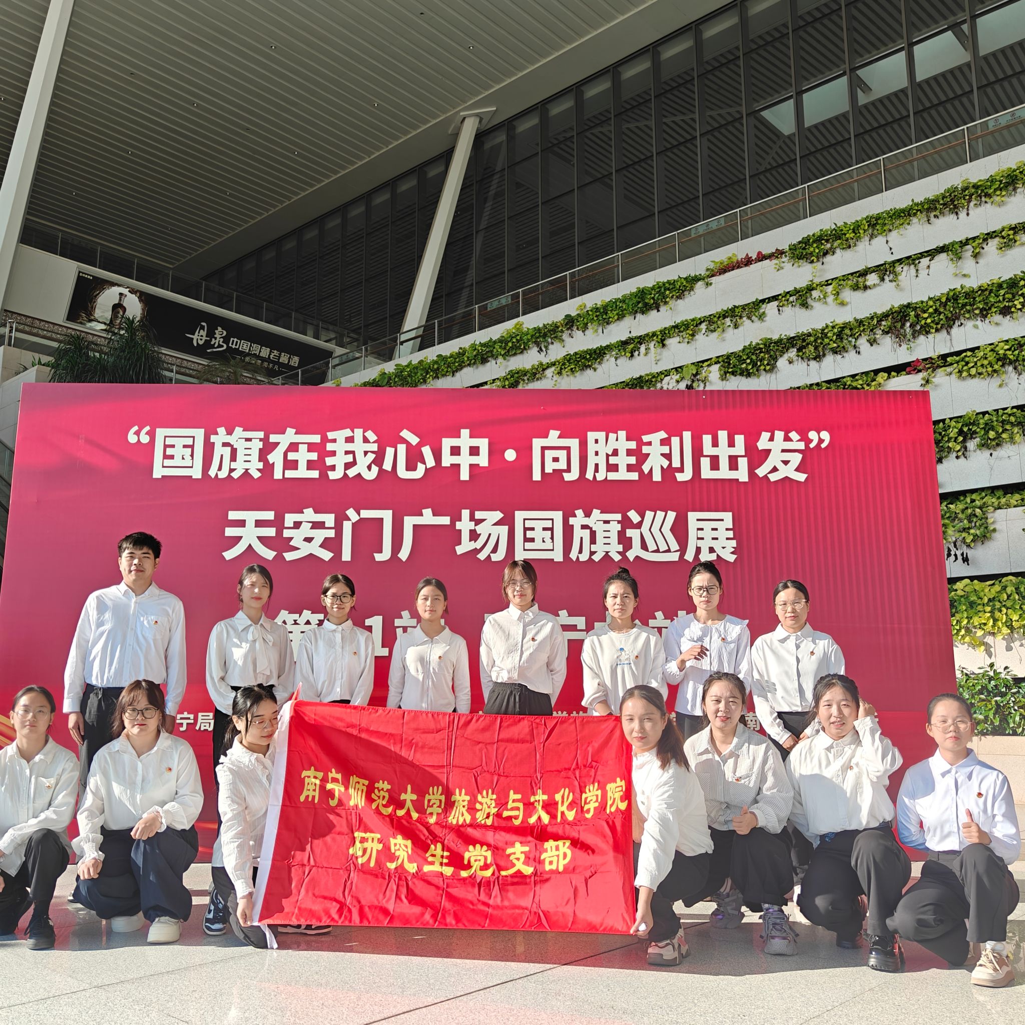 为深入学习贯彻党的二十届四中全会精神,厚植研究生党员爱国主义情怀,强化党建联盟单位协同育人实效,11月14日上午,旅游与文化学院党委副书记黄珍、研究生党支部书记陈春容带领支部成员,赴南宁北站落客平台,与南宁车站、南宁北站派出所等党建联盟单位共同参与“国旗在我心中——向胜利出发”天安门广场国旗巡展第11站(南宁北站)爱国主义教育活动,在庄重仪式与深度互动中传承红色基因,凝聚旅文学子奋进力量。