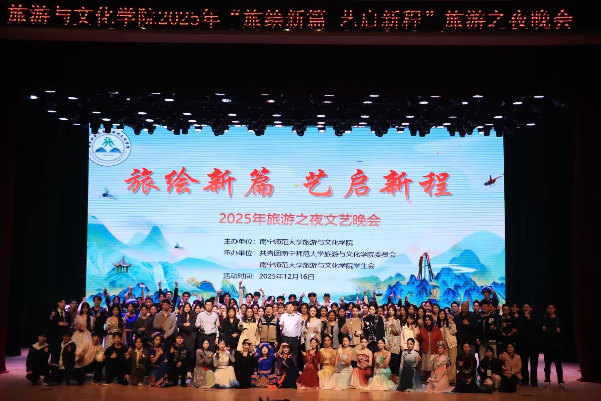 12月16日晚,旅游与文化学院在武鸣校区音舞院1号报告厅举行主题为“旅绘新篇 艺启新程”的2025年旅游之夜。学校相关职能部门负责人、各二级学院师生代表,学院党政领导班子成员、师生代表及各界嘉宾齐聚现场,共赏这场融合艺术与青春的视听盛宴。