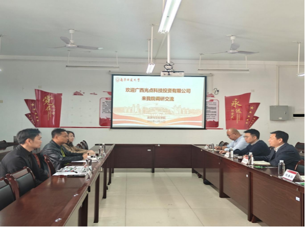 段文军院长代表学院介绍了学科专业设置、师资队伍建设、人才培养成果及现有校企合作基础。他强调,产教融合是应用型人才培养的关键路径,学院始终将校企合作作为提升办学质量的重要抓手,期待以此次交流为纽带,进一步加强与广西光点科技投资有限公司的常态化沟通协作,聚焦人才培养提质、实践基地升级等关键领域精准发力,实现校企双赢发展。