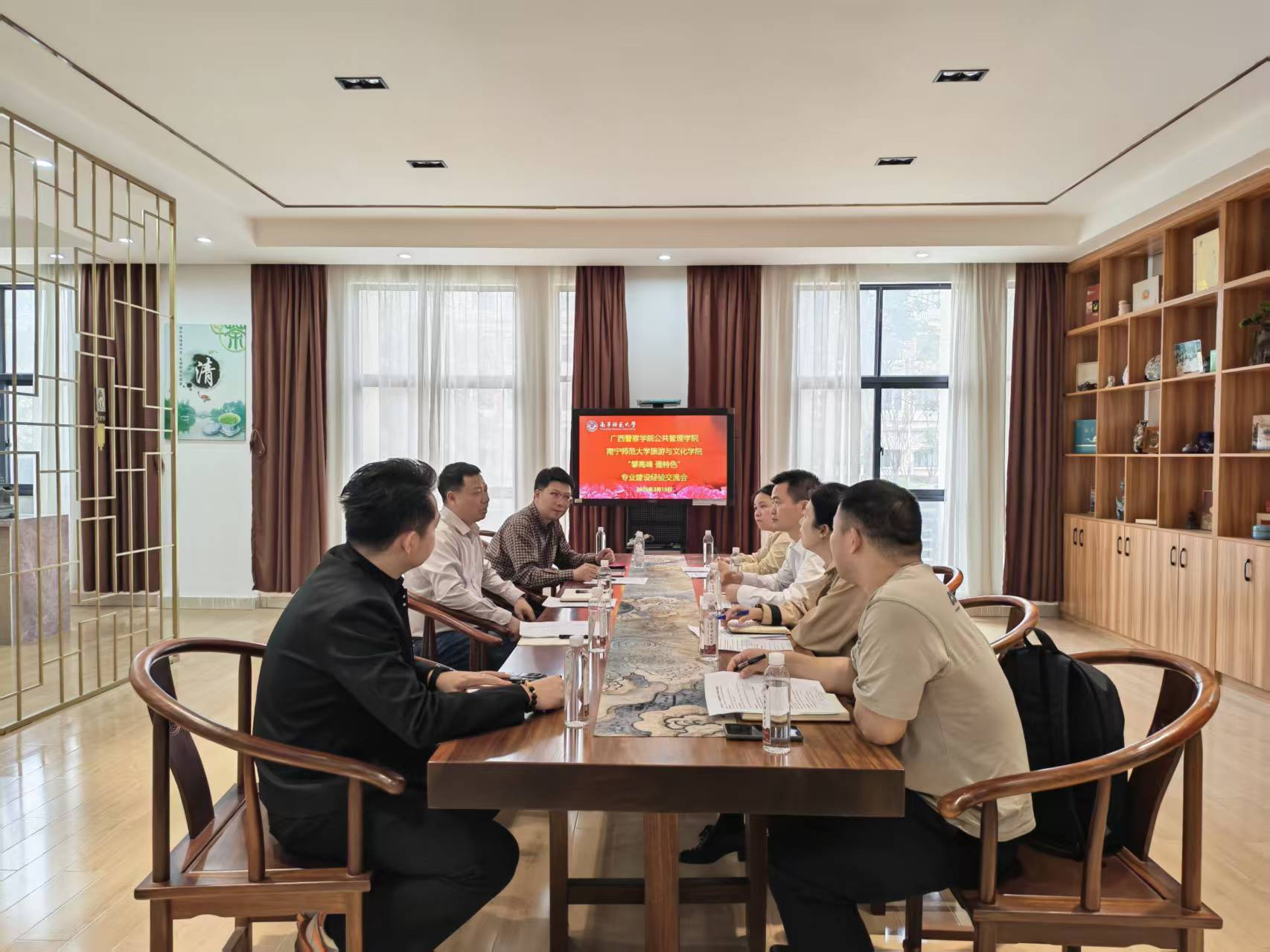 为进一步打造专业特色,提高专业人才培养质量。3月19号下午,广西警察学院公共管理学院农忠海院长带队一行4人到旅游与文化学院围绕“攀高峰、强特色”主题开展航空服务艺术与管理专业建设交流会。座谈会由学院段文军院长主持,副院长钟学进、民航服务艺术与管理专业校企合作方金通公司副主任李宗耀和民航服务艺术与管理专业教研室主任黄素云参加了交流会。