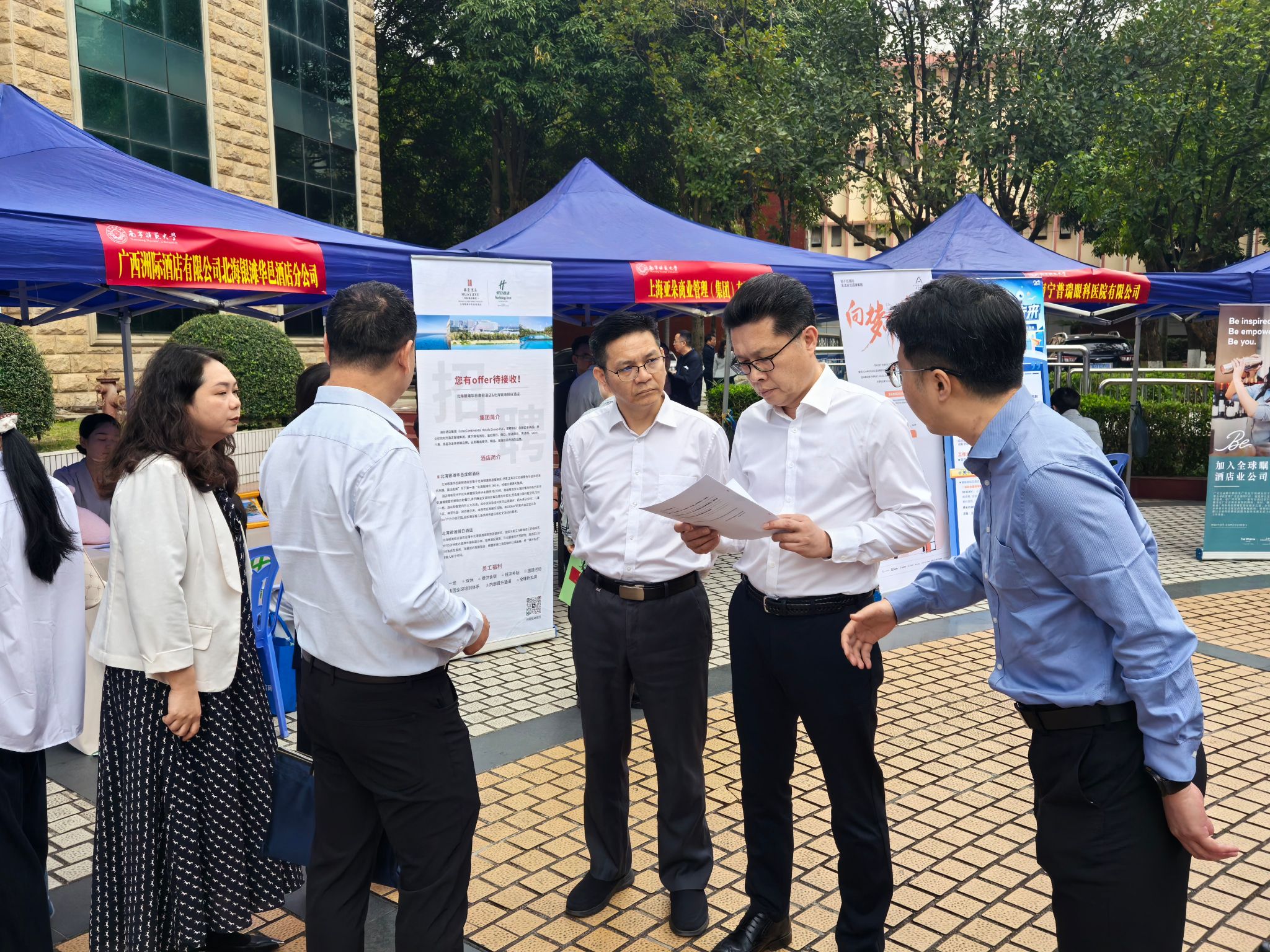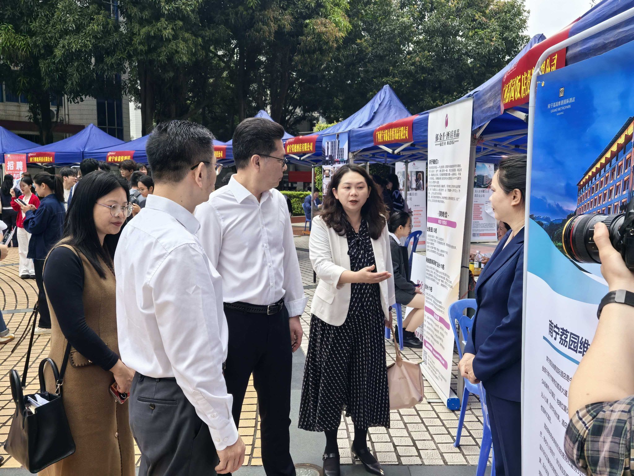 为搭建校企对接平台,助力毕业生高质量充分就业,2026年3月20日,南宁师范大学旅游与文化学院“马聘前程・才聚文旅”2026届毕业生旅游专场双选招聘会在明秀校区文星楼一楼广场举行,学院100余名未就业毕业生及200余名2027届毕业生参加招聘会。学校党委书记张鹏、校长隆广庆等校领导亲临现场指导工作。