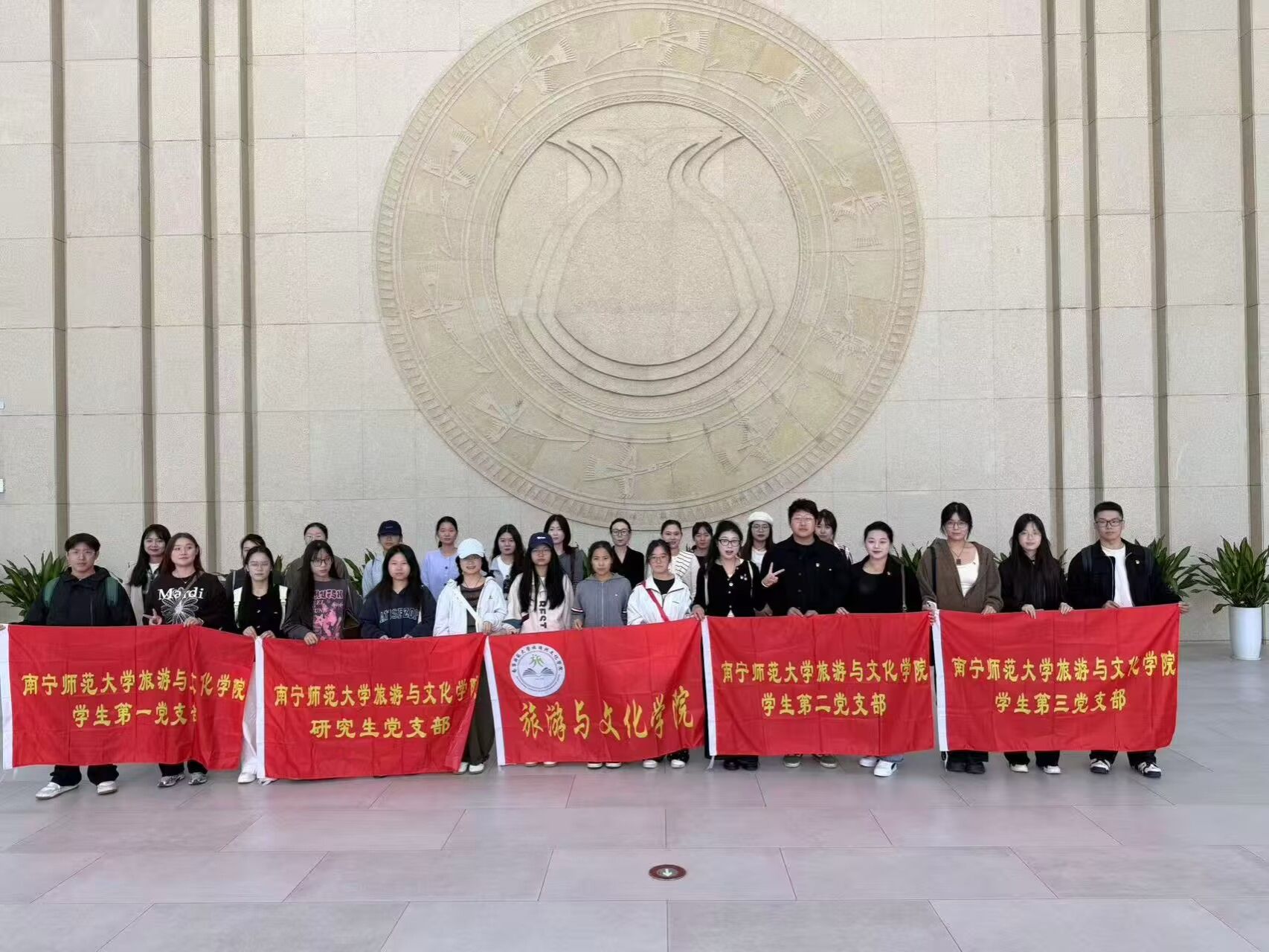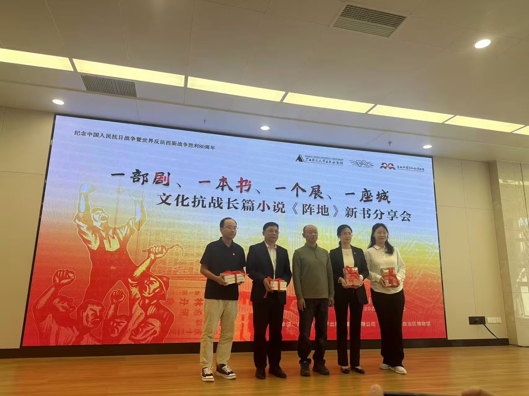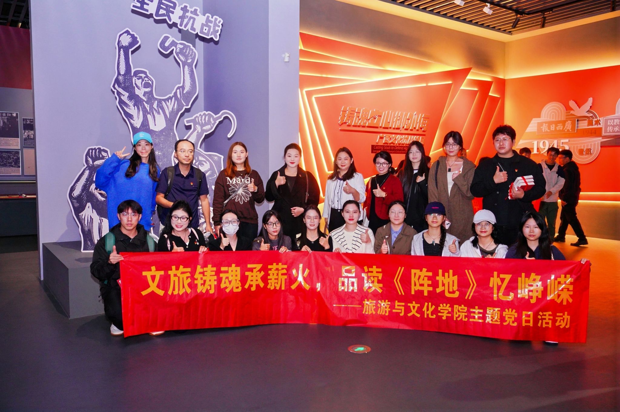 为纪念中国人民抗日战争暨世界反法西斯战争胜利80周年,深刻感悟文化抗战精神伟力,引导师生党员从峥嵘岁月中汲取奋进力量,11月12日上午,旅游与文化学院党委组织党员师生代表赴广西壮族自治区博物馆参加文化抗战长篇小说《阵地》新书分享会。本次“文旅铸魂承薪火,品读《阵地》忆峥嵘”主题党日活动,在沉浸式学习中重温文化抗战的热血岁月,让红色基因在文旅融合中代代相传。